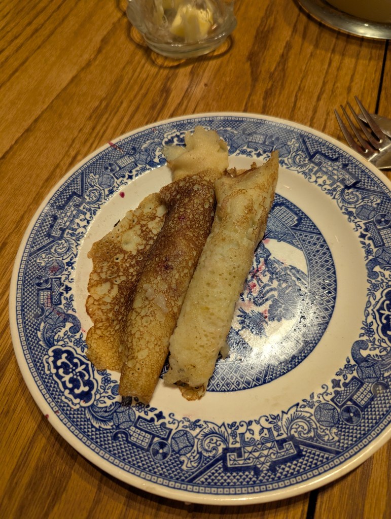 We made a new recipe for dinner — beef rouladen. It was Dean’s idea because we had some flank steak in the freezer. It was delicious. I’ll definately make it again. Dean made crepes with blueberry filling for dessert. Yum!