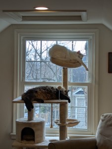 The cats happily joined me in the attic because it was warm and their cat tree was where they like it, in front of the window.