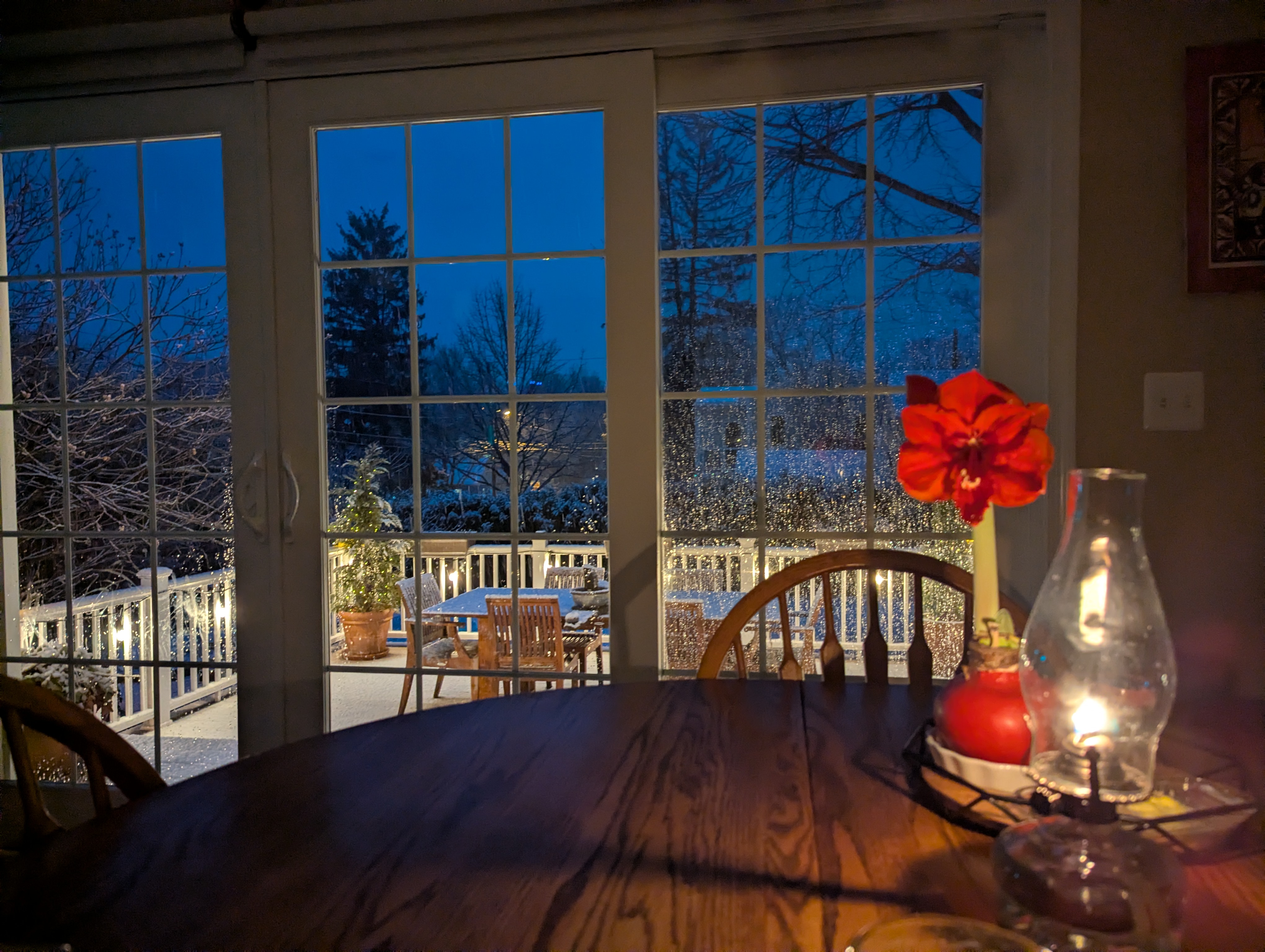 We had a nice dinner while talking to Clare on the phone and watching the snow fall.